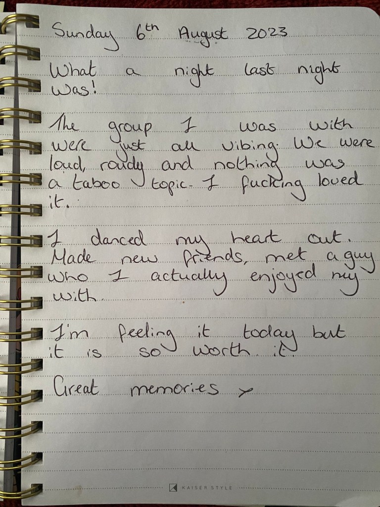 Most of my journal entries for 2023 are pretty dark and deep. I was beginning my journey in processing the abuse I had gone through back in a relationship I had had earlier on in life. So, to come across this entry, and to have the memories of the night still so clearly in my head, I just had to include it in here. I remember at the time I was torn between writing about the experience or about how the night as a whole made me feel. I chose to write about the night as a whole. It was a sprinkle of laughter in a journal that held a lot of weight.